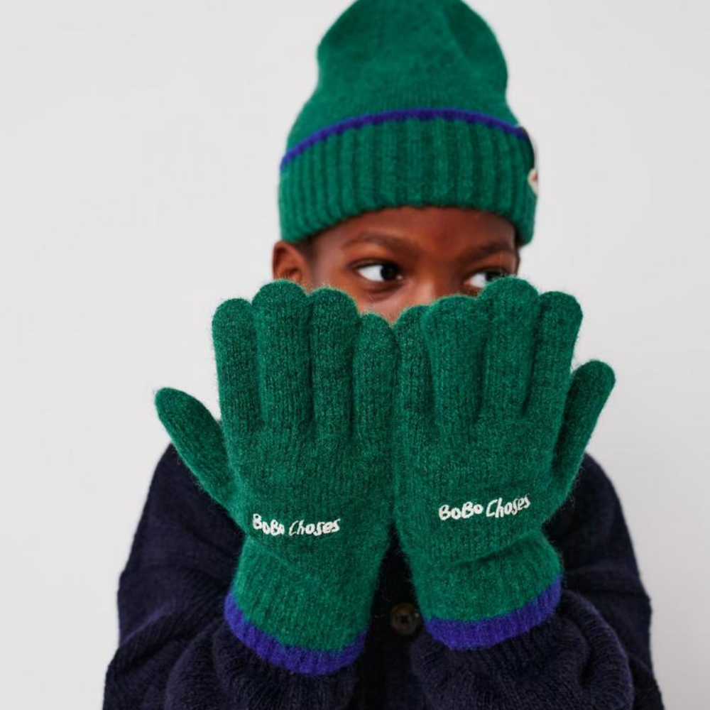 De Bobo Choses Gloves is een prachtig paar handschoenen die wij stiekem zelf ook wel zouden willen: die kleuren combi! Diep donkergroen met kobaltblauw en geborduurd logo. Lekker zacht Γ©n warm.