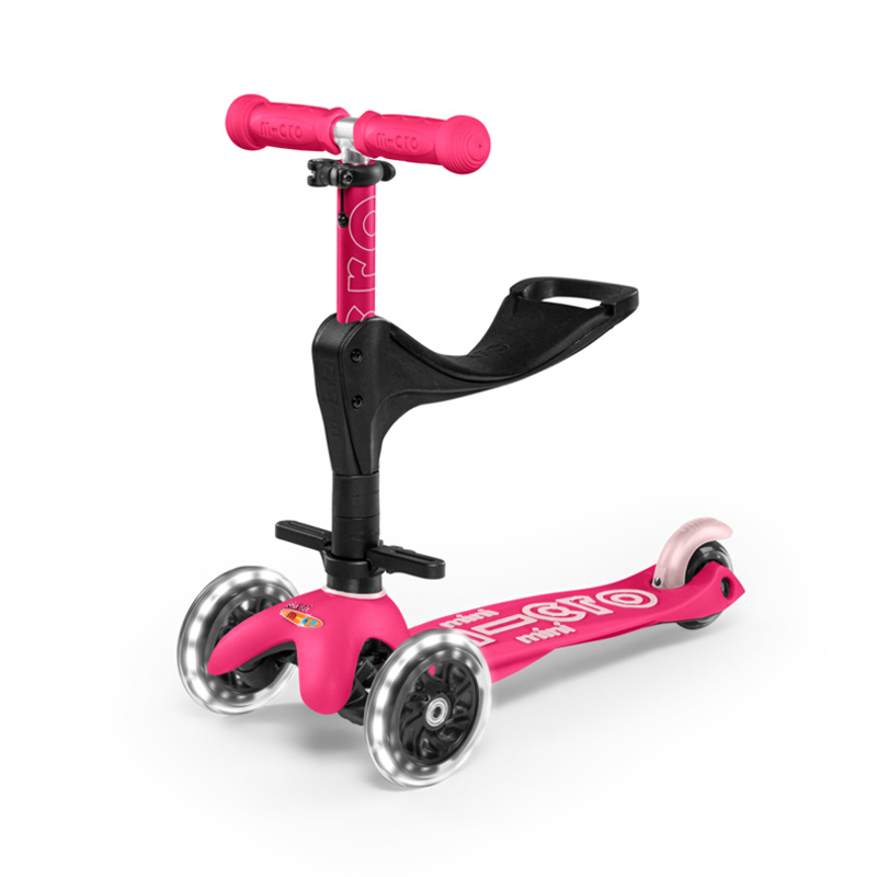 De Mini Micro 3in1 kinderstep is in verschillende stadia te gebruiken: eerst met het zitje en duwstang, daarna kan het zitje eraf worden gehaald en kan je kindje gewoon gaan steppen met de kortere stuurstang. Het T-stuur is in hoogte verstelbaar zodat de step mee kan groeien met je kind en zijn of haar ontwikkeling. Uit ervaring is gebleken dat de Mini Micro step direct en jaren lang een van de favoriete stukken speelgoed is!